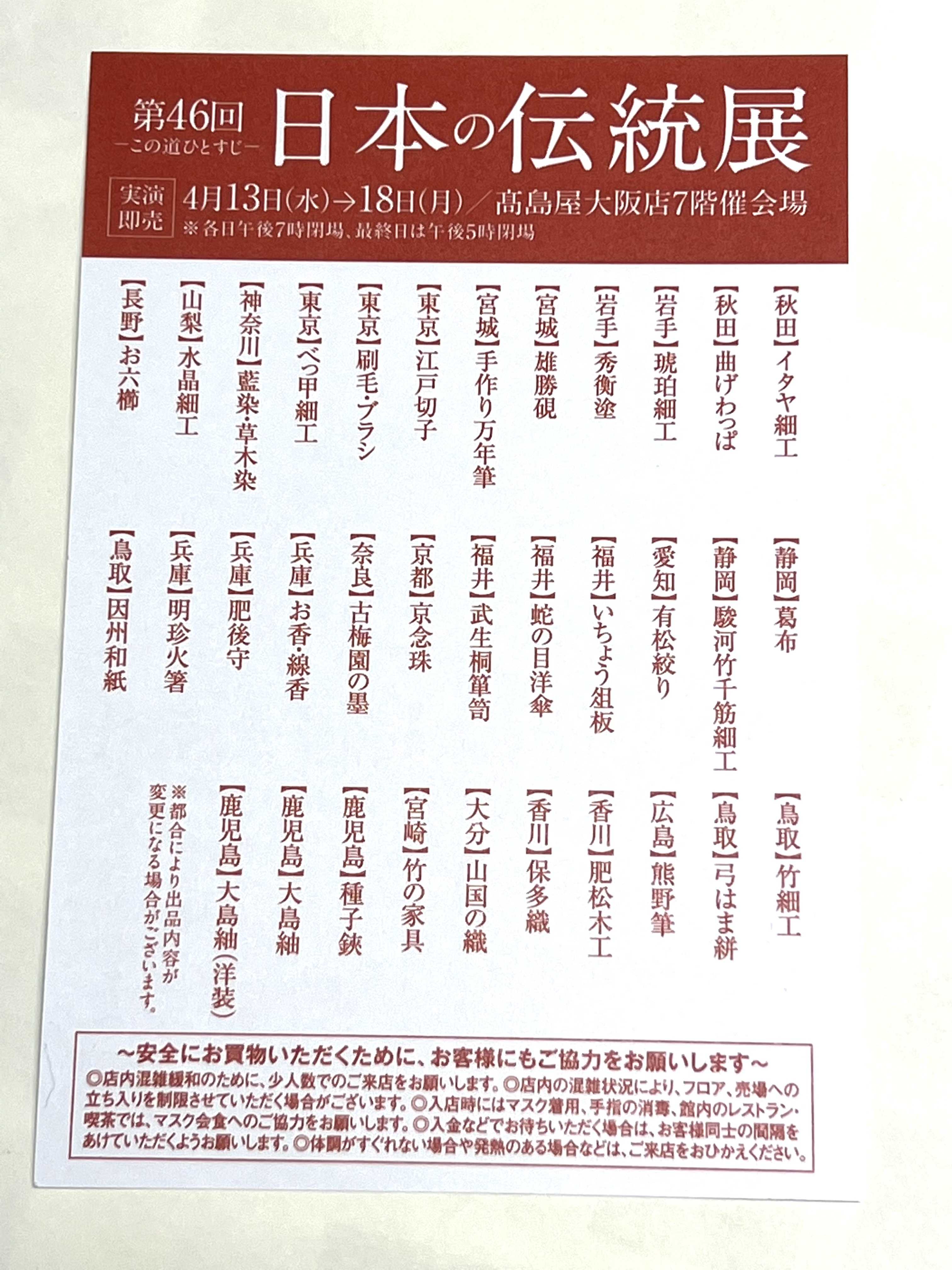 「第46回-この道ひとすじ-日本の伝統展」 高島屋大阪店 7階催場での淡路梅薫堂デパート催事のご案内